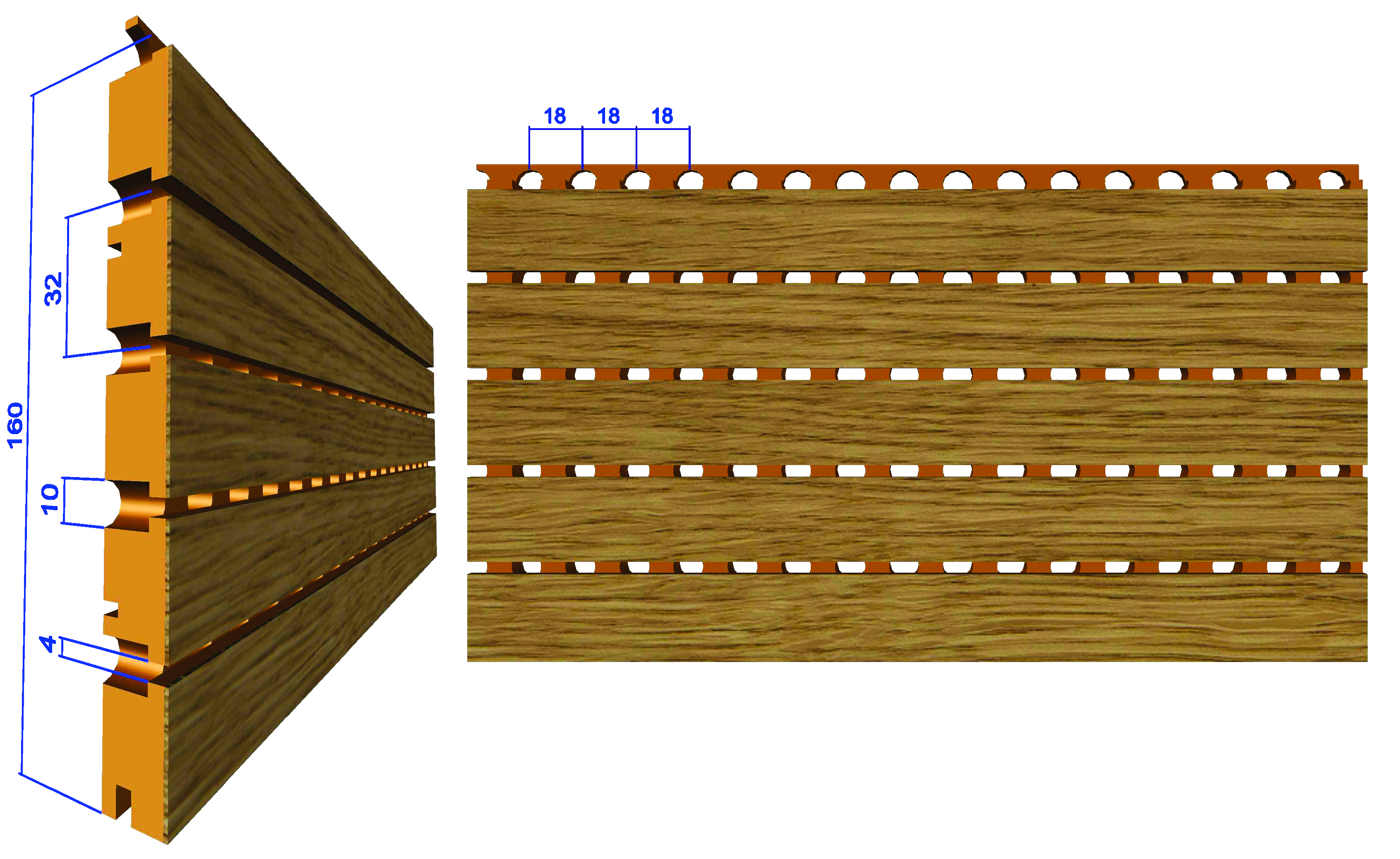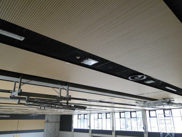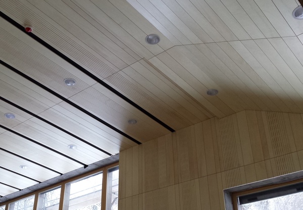 Base material: MDF, plywood or composite panels Panel size: 160x2400, 160x3000, 160x1500, 160x custom length Weight kg/m2: 7,29 Surface: melamine lamination , reall wood veneer, HPL Surface treatment: Standard WB coating , oil /wax coating, staining etc. Fire classification: up to B s1.d.0 , EU norm EN 13501-1 Humidity resistance: 70% standard to 95% Humidax Acoustical treatment: Acoustical fleece 155g/m2 Open area: 13,7% Suspension: Standard wood trims or Omega profile on 600mm axis -