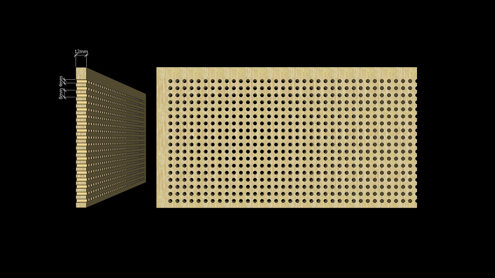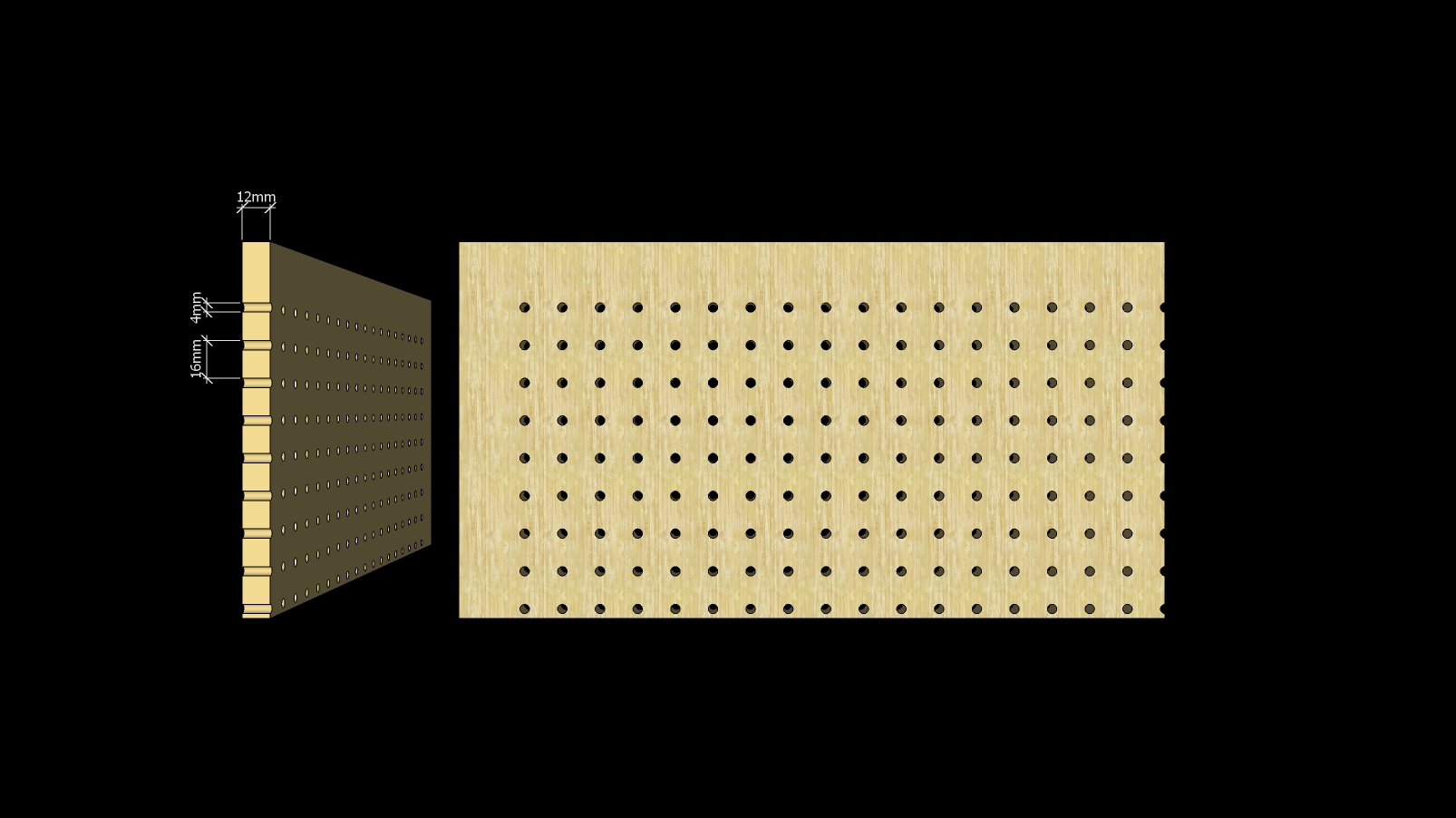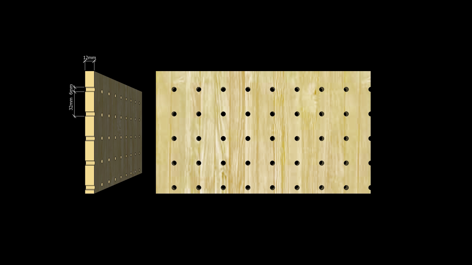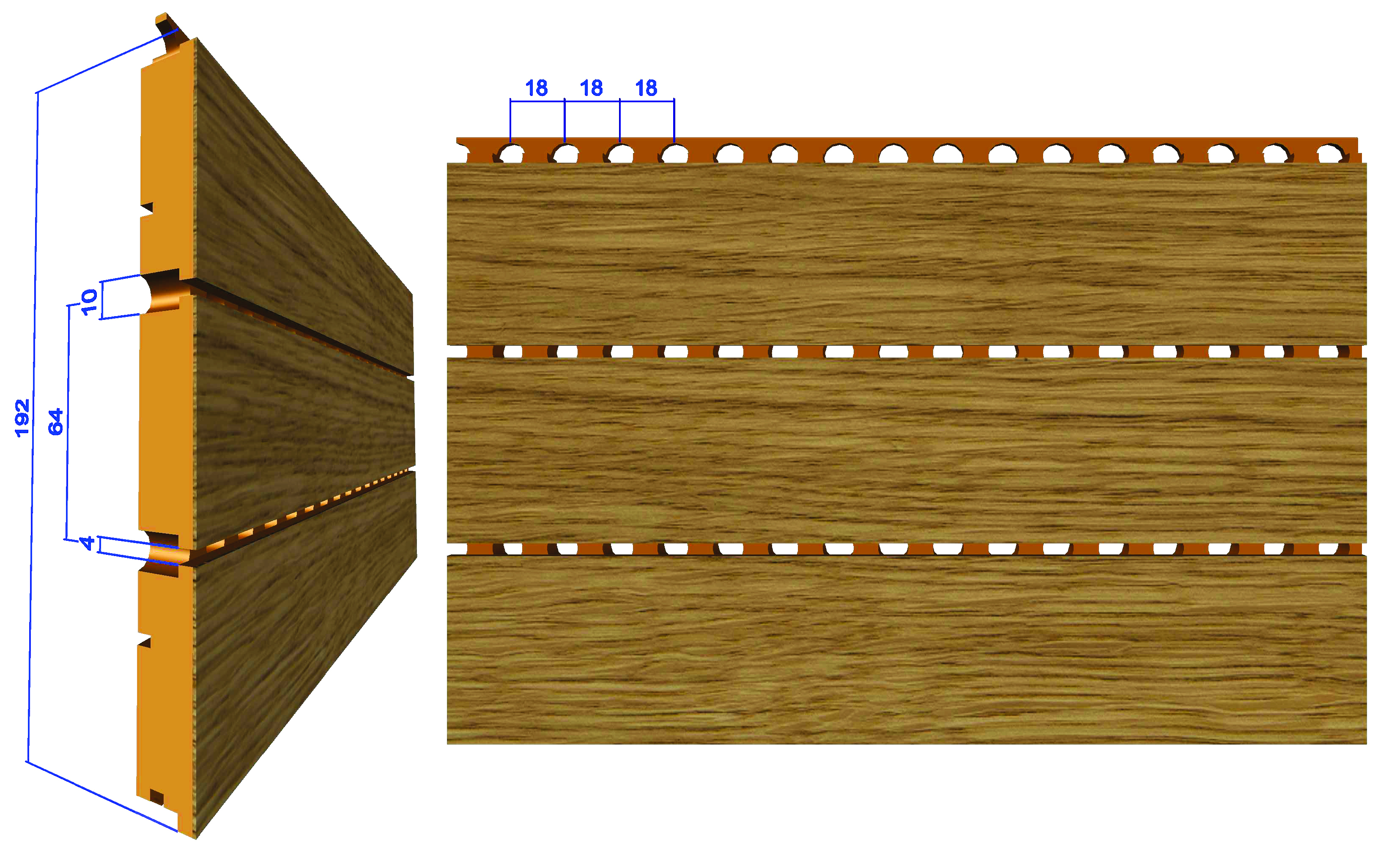 Base material: MDF, plywood or composite panels Panel size: 160x2400, 160x3000, 160x1500, 160x custom length Weight kg/m2: 7,29 Surface: melamine lamination , reall wood veneer, HPL Surface treatment: Standard WB coating , oil /wax coating, staining etc. Fire classification: up to B s1.d.0 , EU norm EN 13501-1 Humidity resistance: 70% standard to 95% Humidax Acoustical treatment: Acoustical fleece 155g/m2 Open area: 13,7% Suspension: Standard wood trims or Omega profile on 600mm axis -