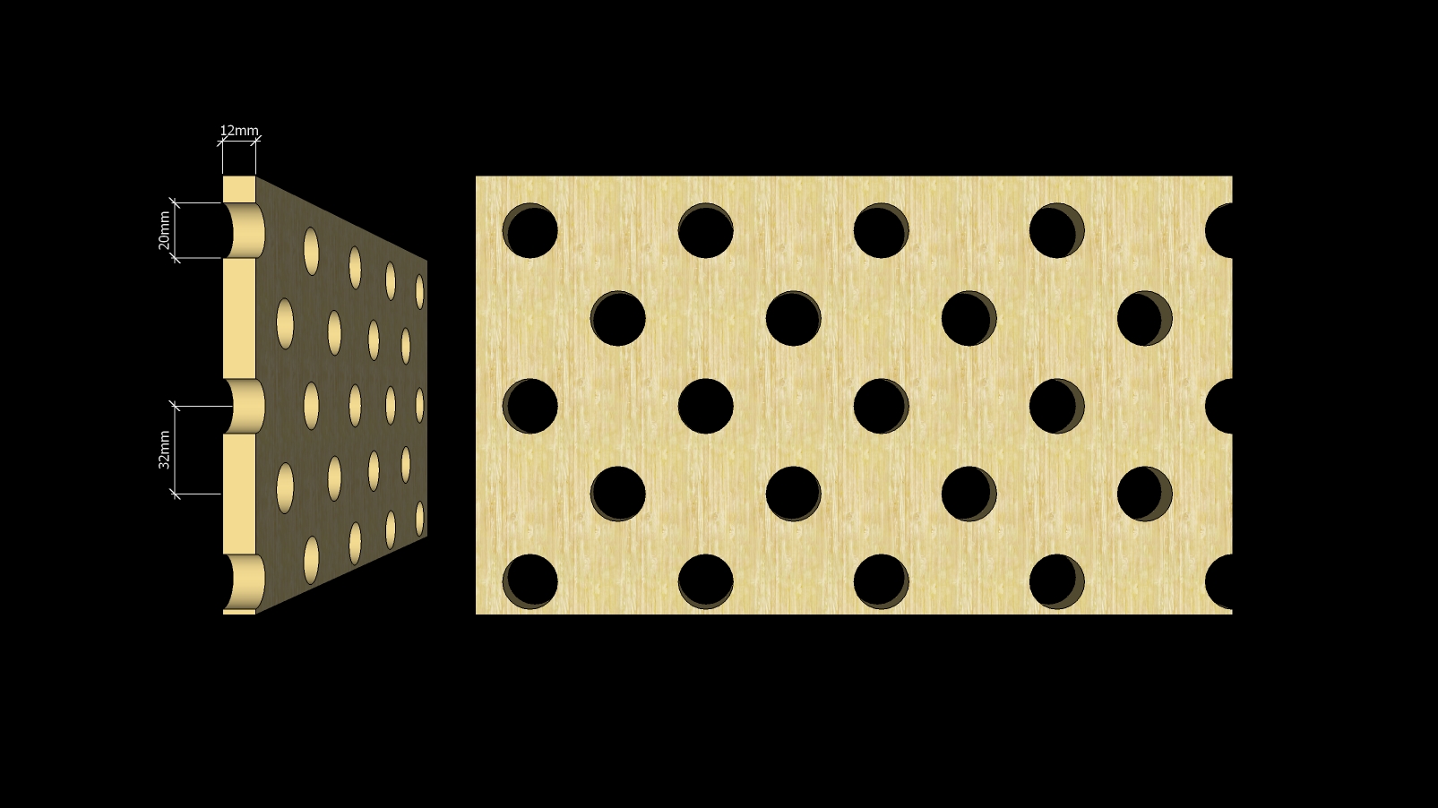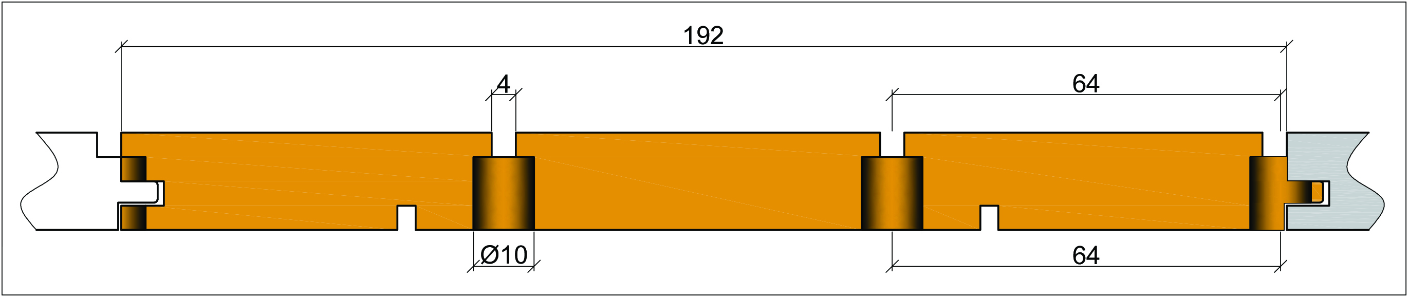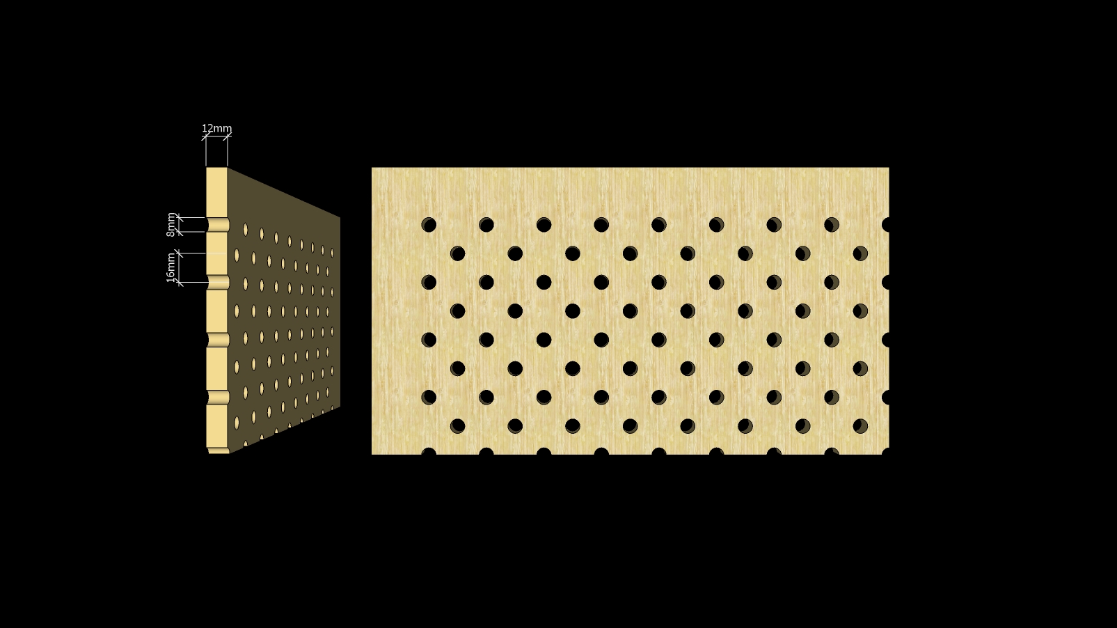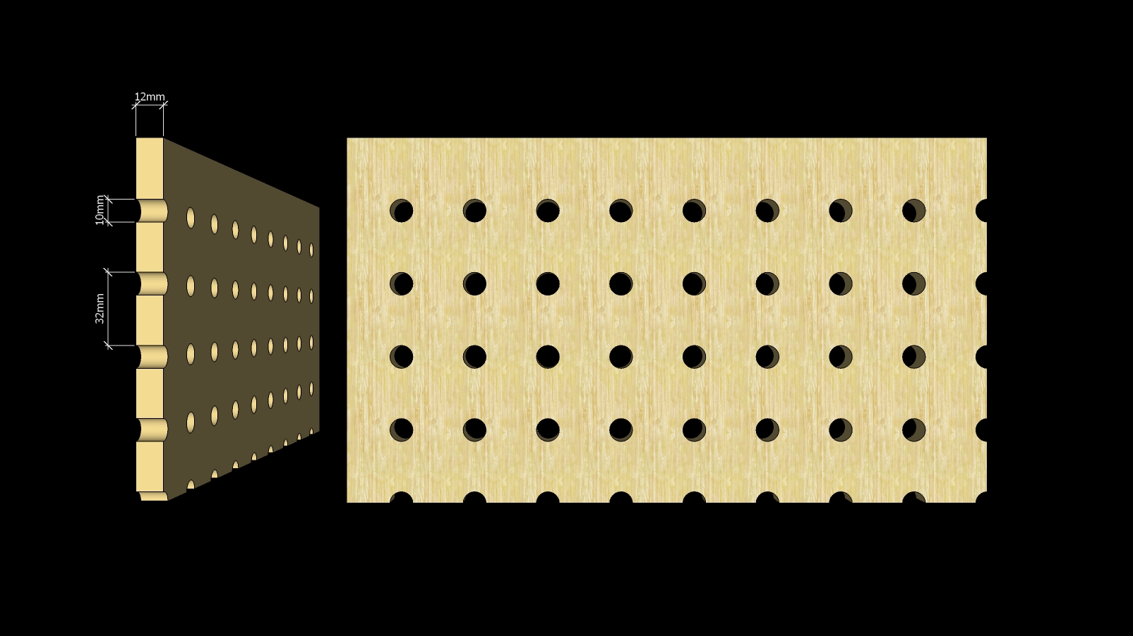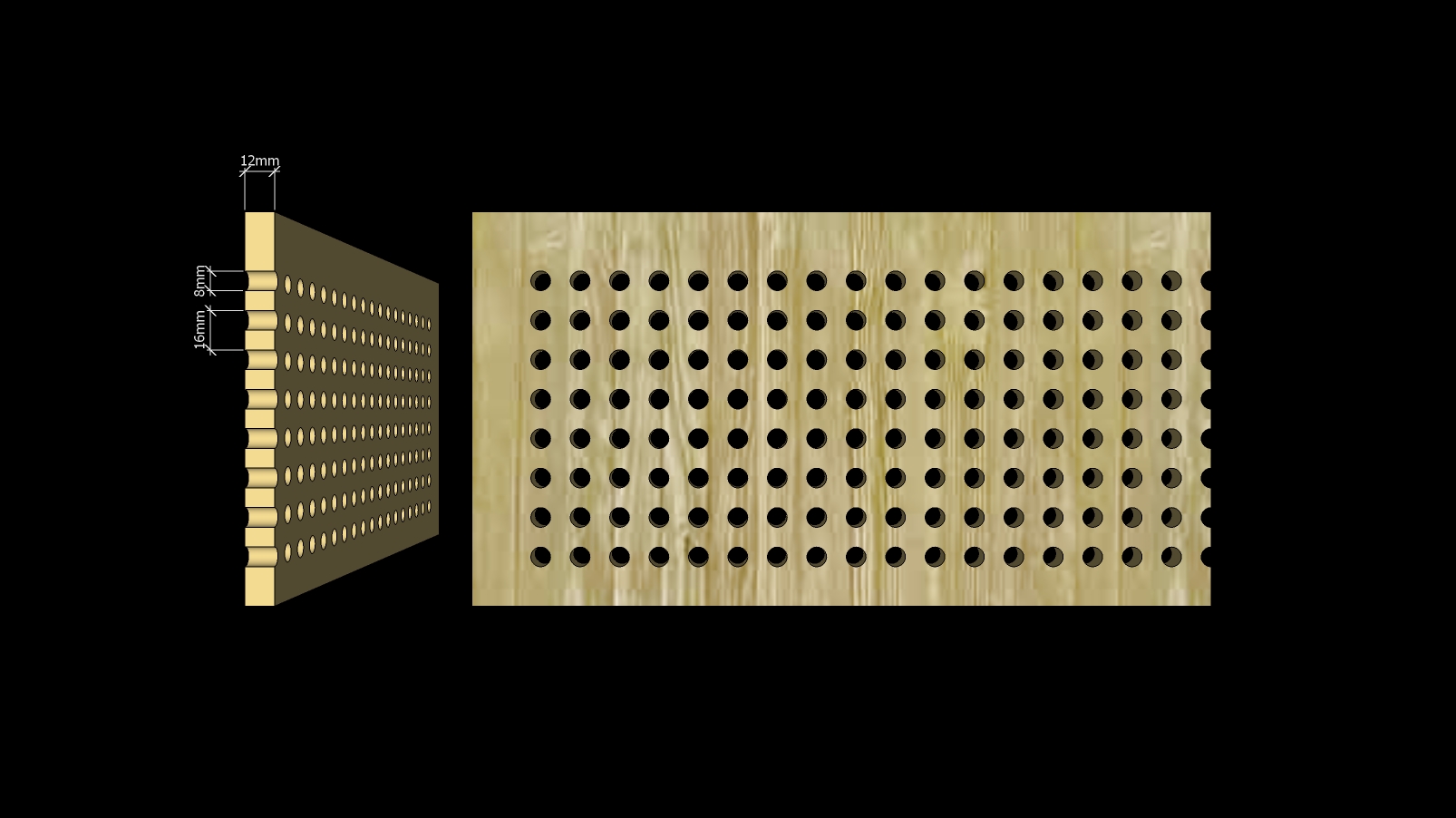 Base material: MDF, plywood or composite panels Panel size: 160x2400, 160x3000, 160x1500, 160x custom length Weight kg/m2: 7,29 Surface: melamine lamination , reall wood veneer, HPL Surface treatment: Standard WB coating , oil /wax coating, staining etc. Fire classification: up to B s1.d.0 , EU norm EN 13501-1 Humidity resistance: 70% standard to 95% Humidax Acoustical treatment: Acoustical fleece 155g/m2 Open area: 13,7% Suspension: Standard wood trims or Omega profile on 600mm axis -