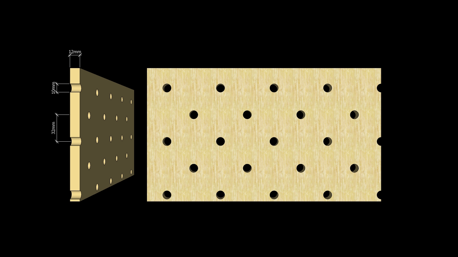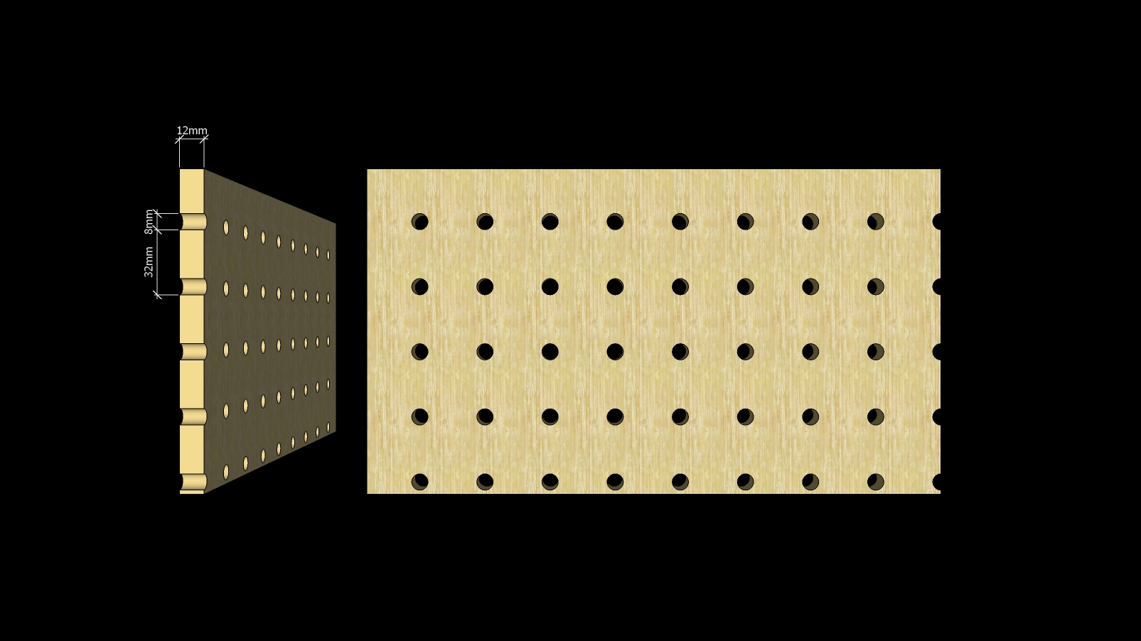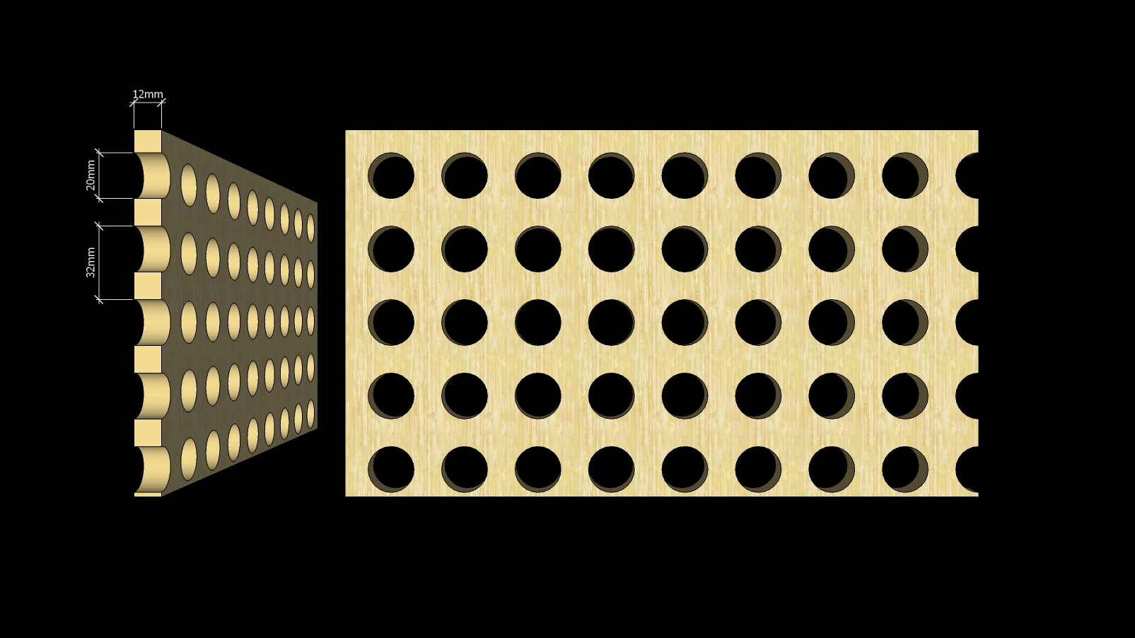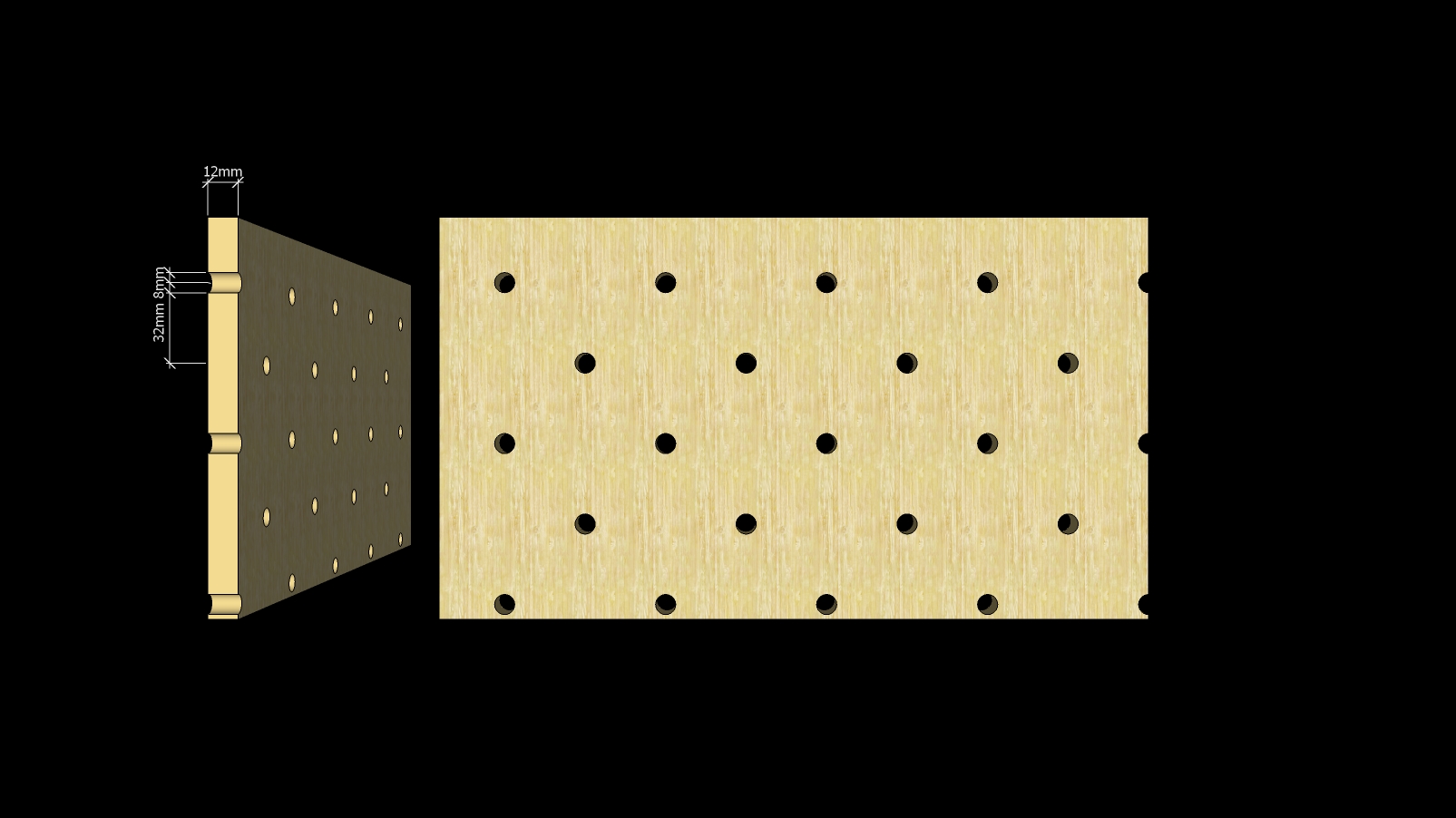 Base material: MDF, plywood or composite panels Panel size: 160x2400, 160x3000, 160x1500, 160x custom length Weight kg/m2: 7,29 Surface: melamine lamination , reall wood veneer, HPL Surface treatment: Standard WB coating , oil /wax coating, staining etc. Fire classification: up to B s1.d.0 , EU norm EN 13501-1 Humidity resistance: 70% standard to 95% Humidax Acoustical treatment: Acoustical fleece 155g/m2 Open area: 13,7% Suspension: Standard wood trims or Omega profile on 600mm axis -