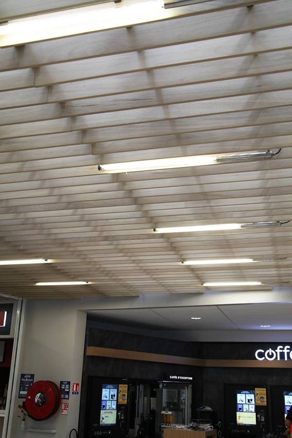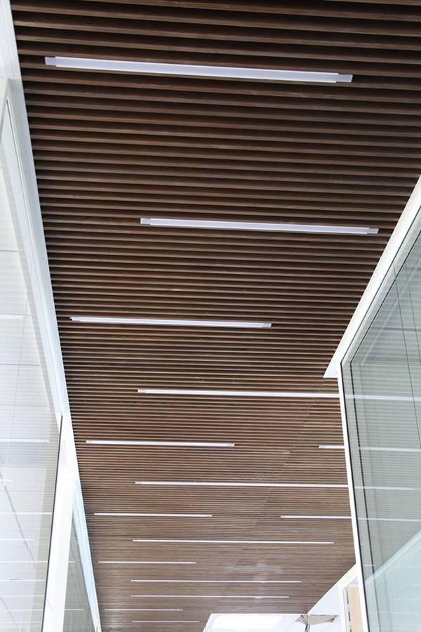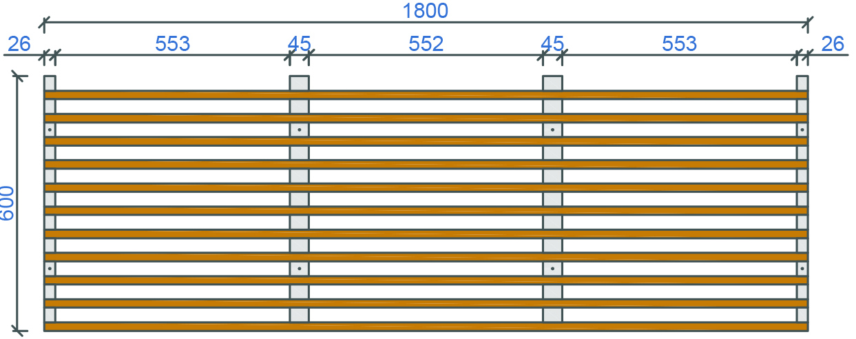 Base material: Real wood: Pine, Larch, Birch, Oak etc. Lath size (wx/hx): 20x42mm Sloted cross bar: 45x35mm+26x35mm No. of blades: 11 Element weight kg/m2: 7,48 Surface: Standard WB coating , oil /wax coating, staining etc. Fire classification: B s1.d0 , EU norm EN 13501- Humidity resistance: 70% standard to 95% treated Acoustical treatment: Rockfon Industrial mineral fibre pad 20mm or acoustical fleece 155g/m2 Open area: 63% Suspension: Standard plaster board studs or wood trims - direct mount