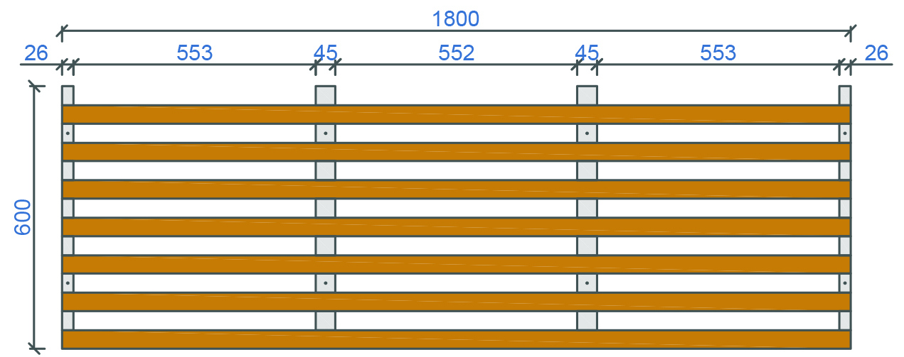 Base material: Real wood: Pine, Larch, Birch, Oak etc. Lath size (wx/hx): 42x20mm Sloted cross bar: 45x35mm+26x35mm No. of blades: 7 Element weight kg/m2: 4,76 Surface: Standard WB coating , oil /wax coating, staining etc. Fire classification: B s1.d0 , EU norm EN 13501- Humidity resistance: 70% standard to 95% treated Acoustical treatment: Rockfon Industrial mineral fibre pad 20mm or acoustical fleece 155g/m2 Open area: 51% Suspension: Standard plaster board studs or wood trims - direct mount