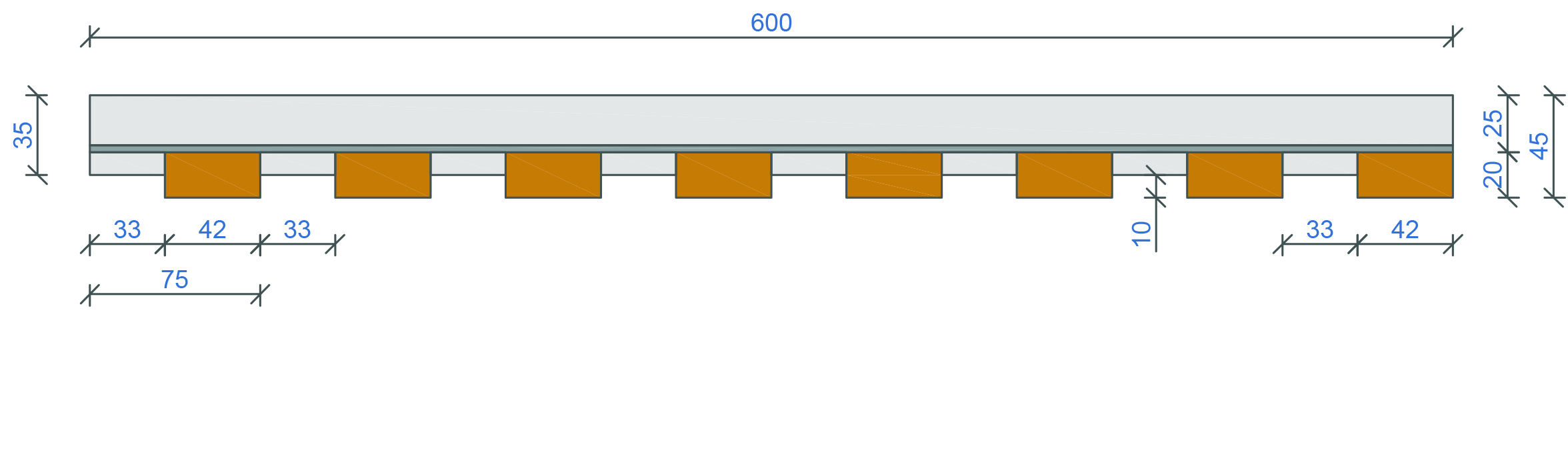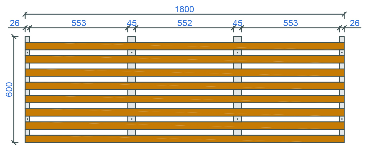 Base material: Real wood: Pine, Larch, Birch, Oak etc. Lath size (wx/hx): 42x20mm Sloted cross bar: 45x35mm+26x35mm No. of blades: 8 Element weight kg/m2: 5,44 Surface: Standard WB coating , oil /wax coating, staining etc. Fire classification: B s1.d0 , EU norm EN 13501- Humidity resistance: 70% standard to 95% treated Acoustical treatment: Rockfon Industrial mineral fibre pad 20mm or acoustical fleece 155g/m2 Open area: 44% Suspension: Standard plaster board studs or wood trims - direct mount