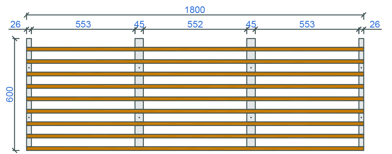 Base material: Real wood: Pine, Larch, Birch, Oak etc. Lath size (wx/hx): 20x42mm Sloted cross bar: 45x35mm+26x35mm No. of blades: 9 Element weight kg/m2: 6,12 Surface: Standard WB coating , oil /wax coating, staining etc. Fire classification: B s1.d0 , EU norm EN 13501- Humidity resistance: 70% standard to 95% treated Acoustical treatment: Rockfon Industrial mineral fibre pad 20mm or acoustical fleece 155g/m2 Open area: 70% Suspension: Standard plaster board studs or wood trims - direct mount