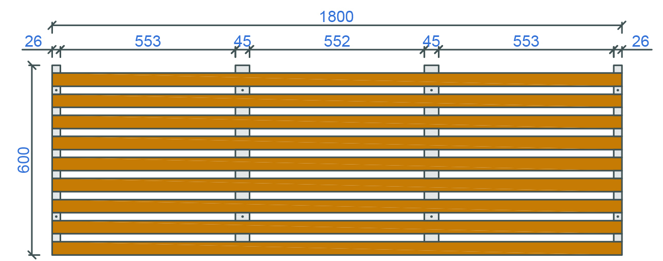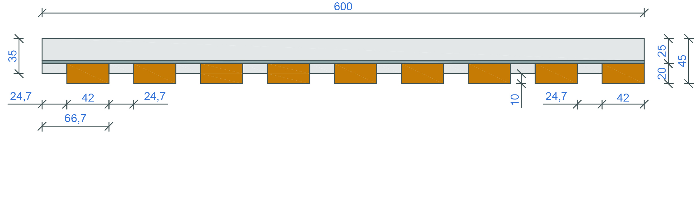 Base material: Real wood: Pine, Larch, Birch, Oak etc. Lath size (wx/hx): 42x20mm Sloted cross bar: 45x35mm+26x35mm No. of blades: 9 Element weight kg/m2: 6,12 Surface: Standard WB coating , oil /wax coating, staining etc. Fire classification: B s1.d0 , EU norm EN 13501- Humidity resistance: 70% standard to 95% treated Acoustical treatment: Rockfon Industrial mineral fibre pad 20mm or acoustical fleece 155g/m2 Open area: 37% Suspension: Standard plaster board studs or wood trims - direct mount